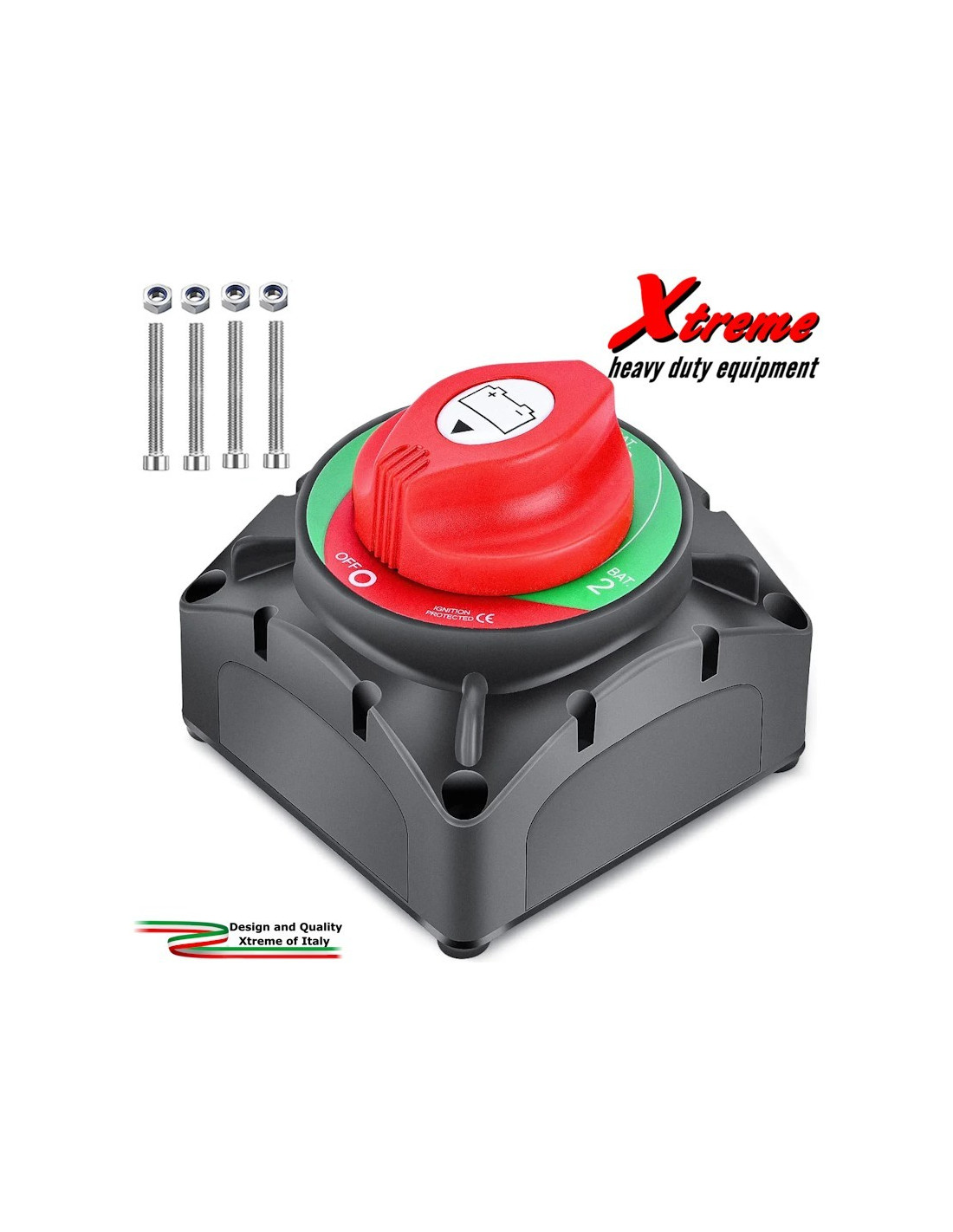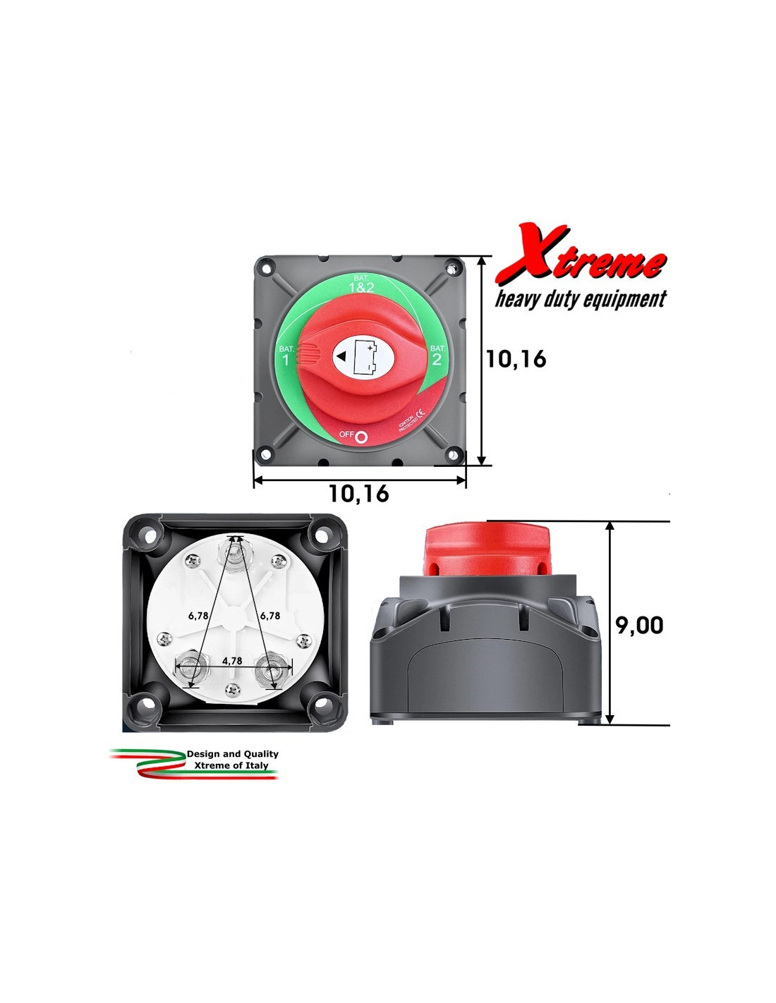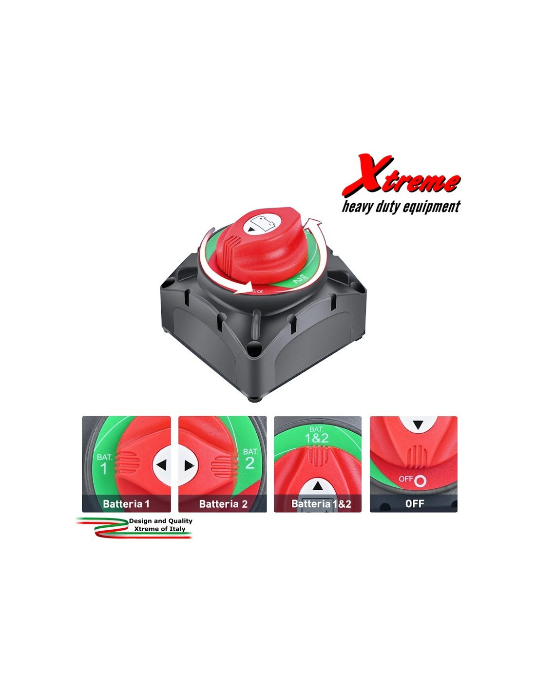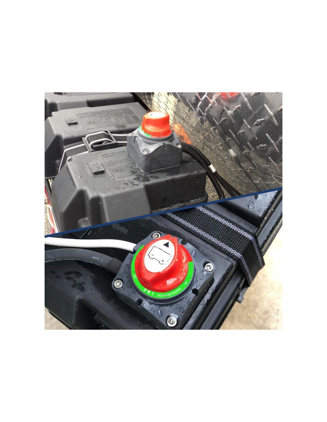 Odklop akumulatorja 600A z možnostjo preklaplanja med dvemi akumulatorji in povezovanja dveh akumulatorjev. Funkcije 1/2/1+2/Off. Kontakti M8, napetost 12-48V, nominalna obremenitev 600A, maksimalna obremenitev 2500A za 5s.