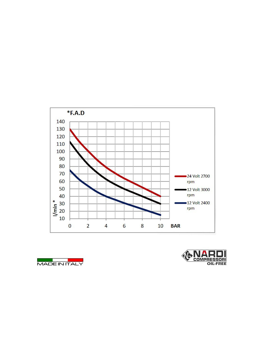 Nardi Esprit 500, kompresor 24/12V, motor dvocilindrični-boxer prisilno hlajen 500W – 3000rpm, pretok zraka 225L/min, delovni tlak max 10 bar, hrup 62dB, integrirana plošča za namestitev v vozilo.