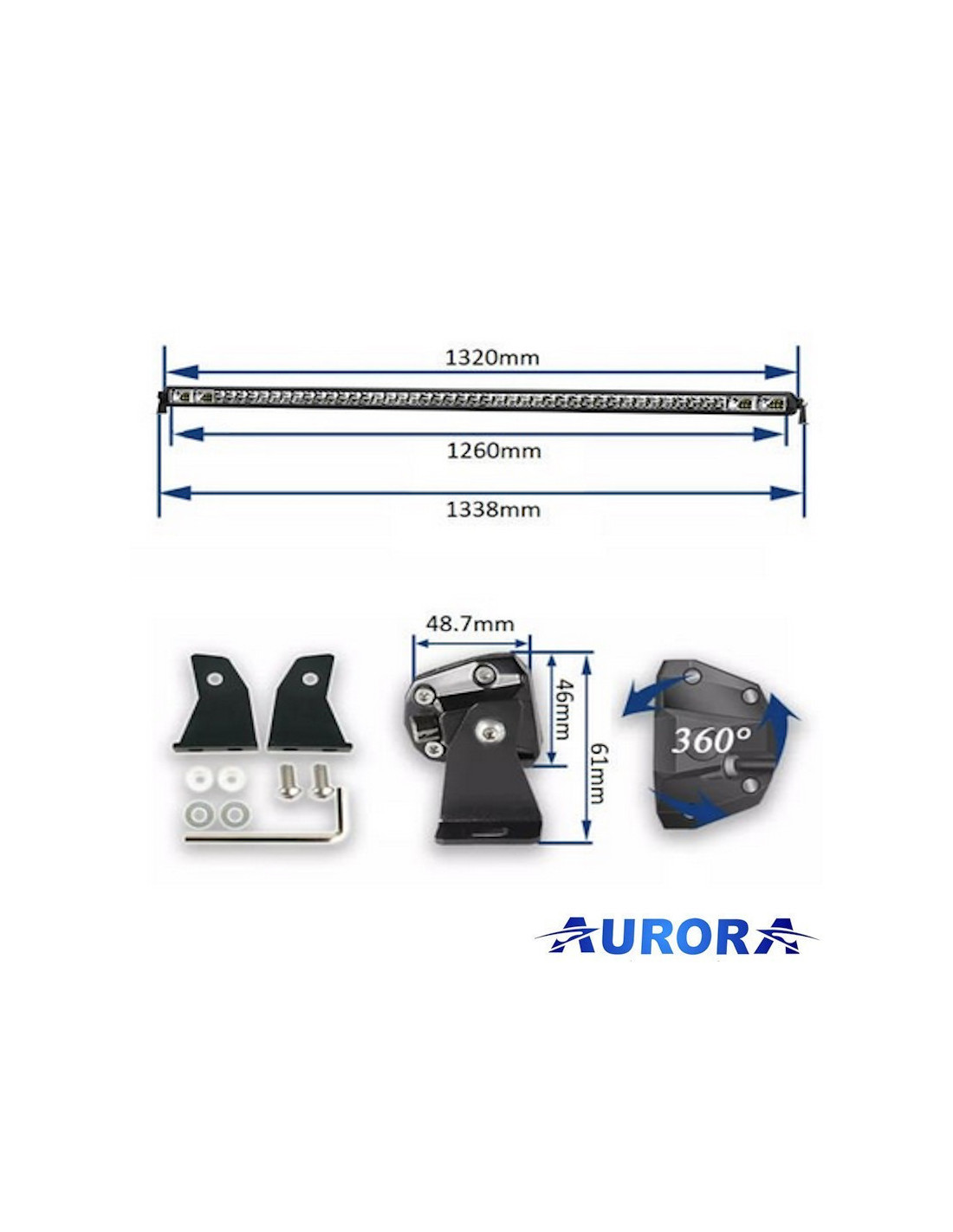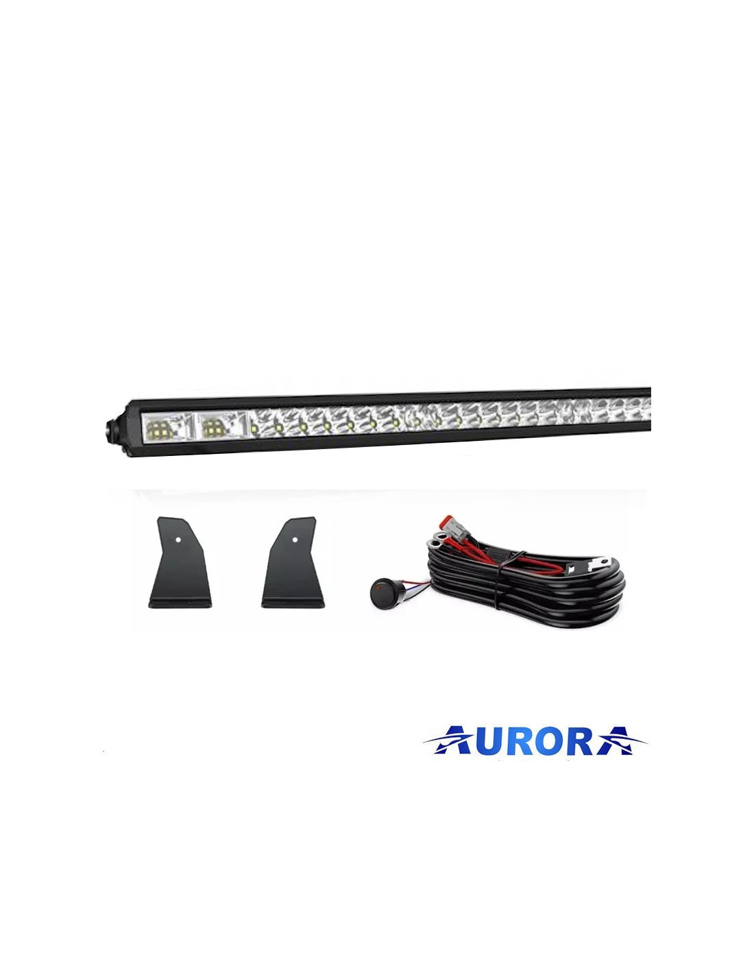 Delovna luč Aurora LED Bar, 50 LED Osram 250W, 23.750 lm, 42 globinskih reflektorjev s kotom snopa 10°, 4 reflektorji z 8 LED s kotom snopa 120°, zaščita IP69K, temperatura uporabe -40° +145°C, napajanje 9-36V. Priloženo: črn pokrov, kabel, rele, stikalo, vodoodporen konektor in nosilec